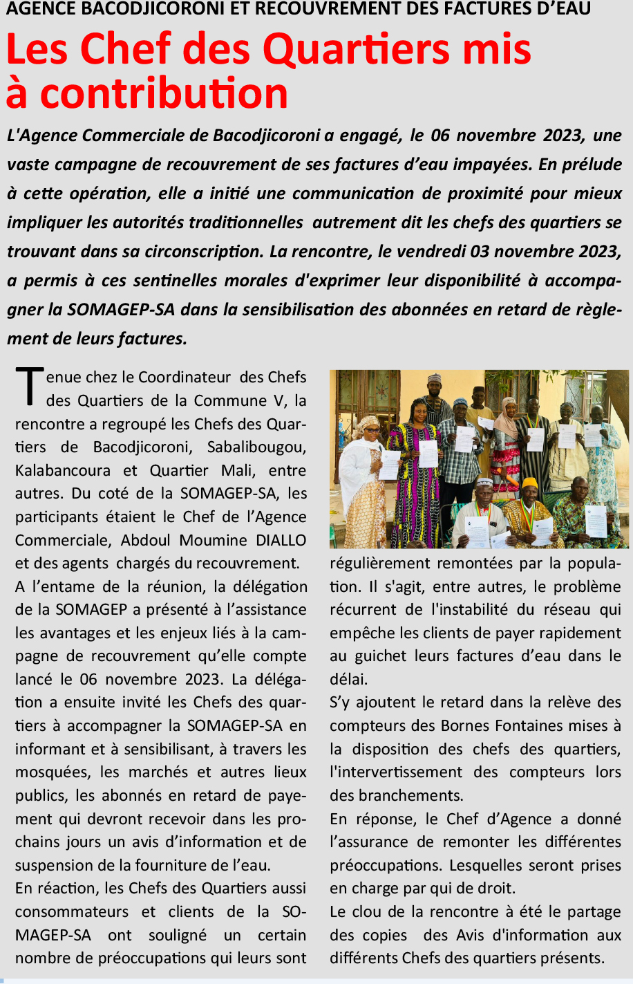 AGENCE BACODJICORONI ET RECOUVREMENT DES FACTURES D’EAU