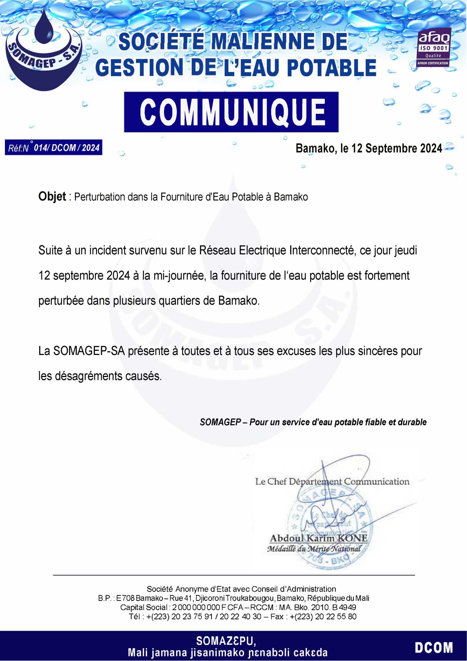 Perturbation dans la Fourniture d’Eau Potable à Bamako