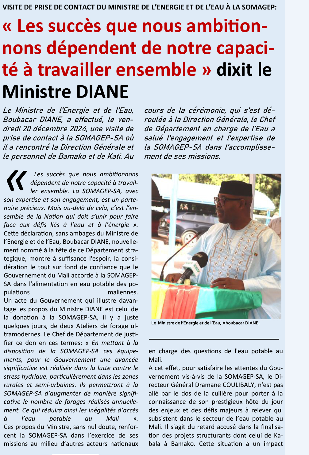 VISITE DE PRISE DE CONTACT DU MINISTRE DE L’ENERGIE ET DE L’EAU À LA SOMAGEP: décembre 23, 2024 | Aucun commentaire