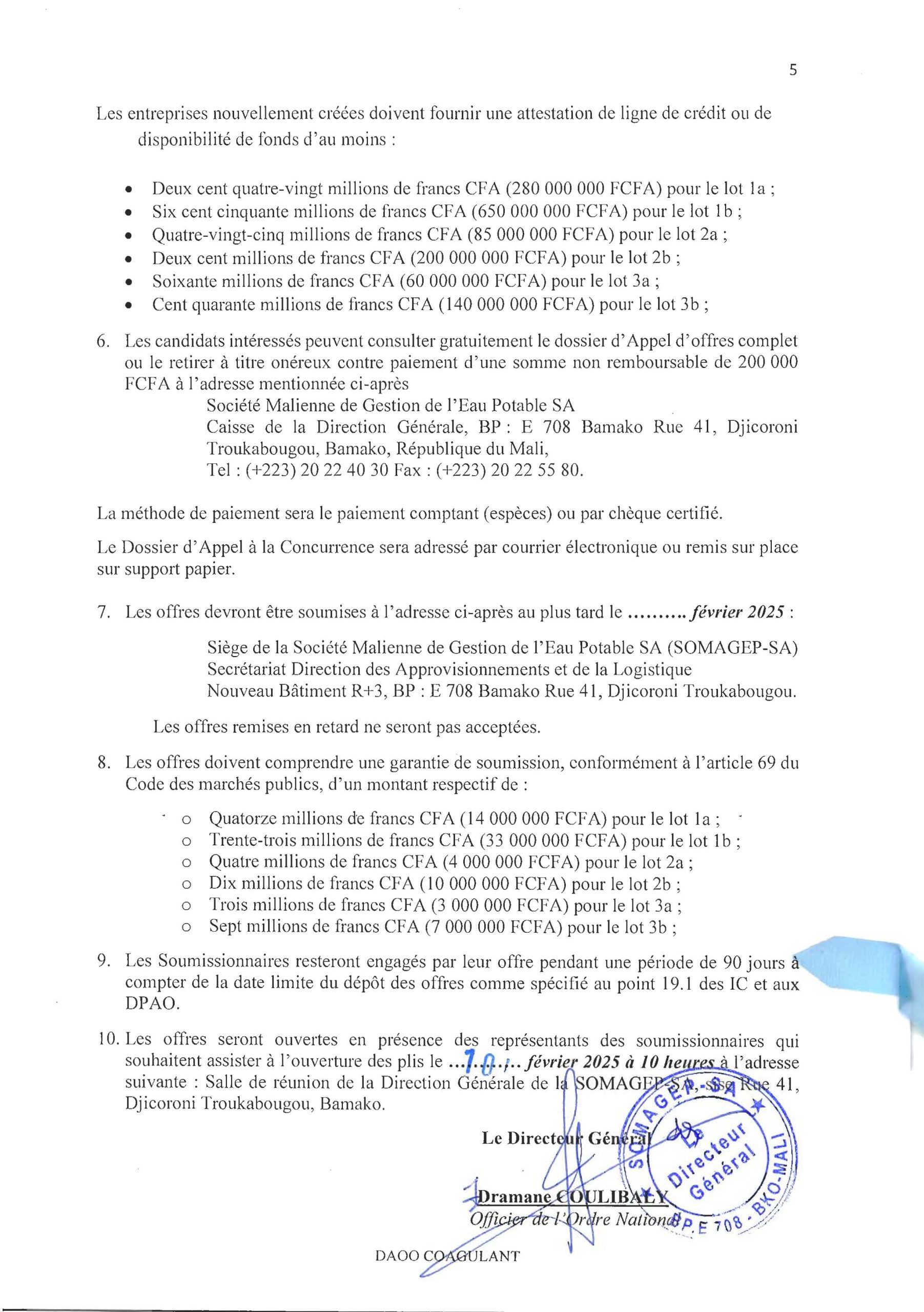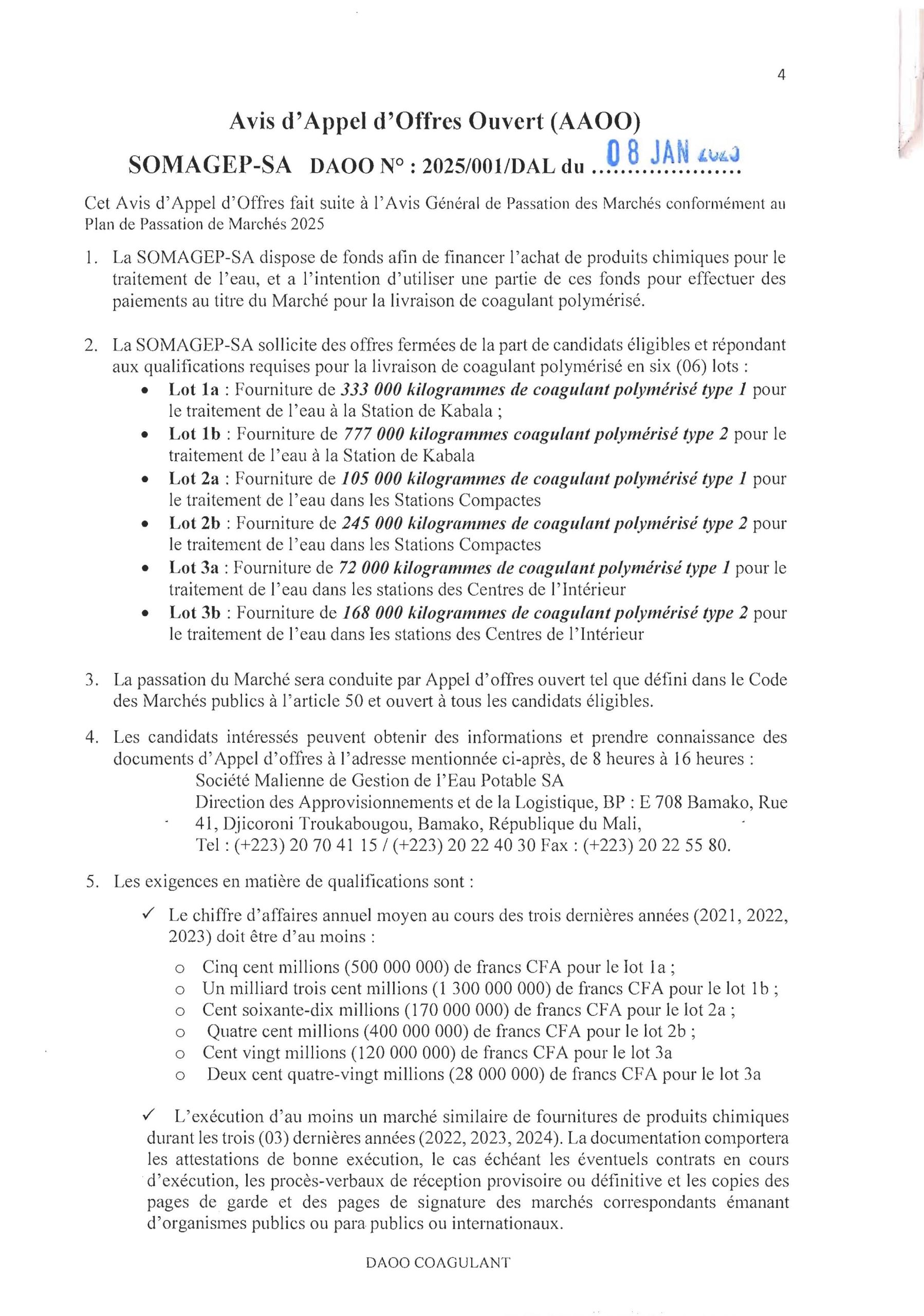 AAO-2025-02- Avis d’Appel d’Offres Ouvert SOMAGEP-SA DAOO N° : 2025/001/DAL janvier 10, 2025 | Aucun commentaire