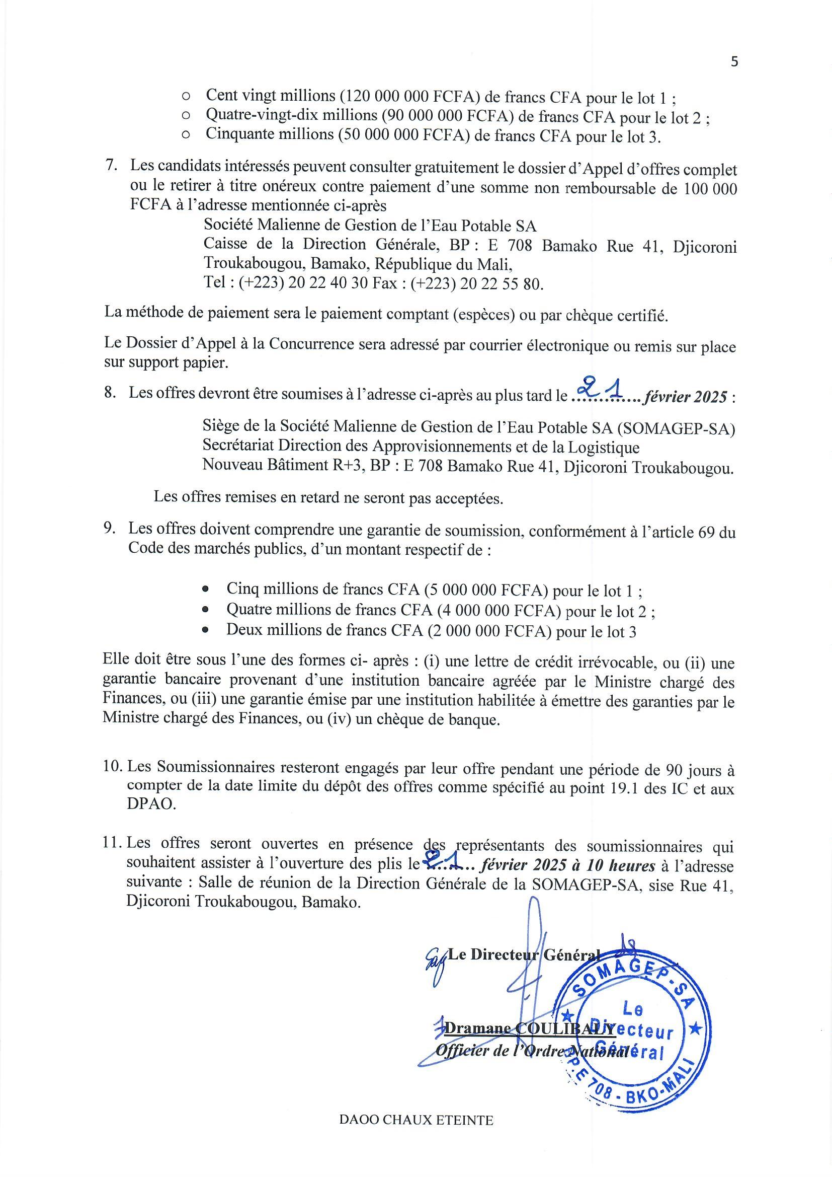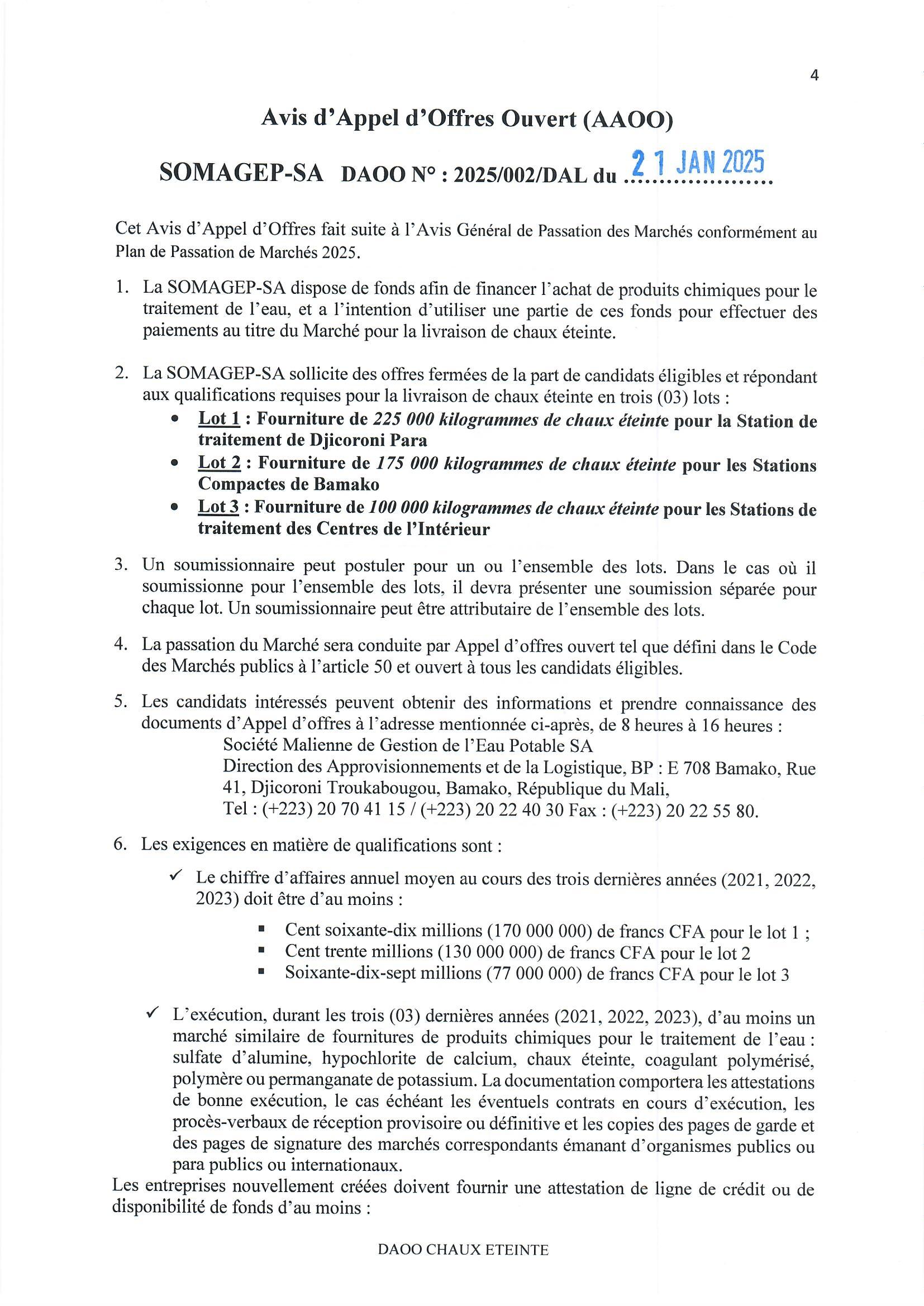 AAO-2025-03- Avis d’ Appel d’Offres Ouvert (AAOO)SOMAGEP-SA DAOO N o : 2025/002/DAL du 21-01-25 janvier 22, 2025 | Aucun commentaire