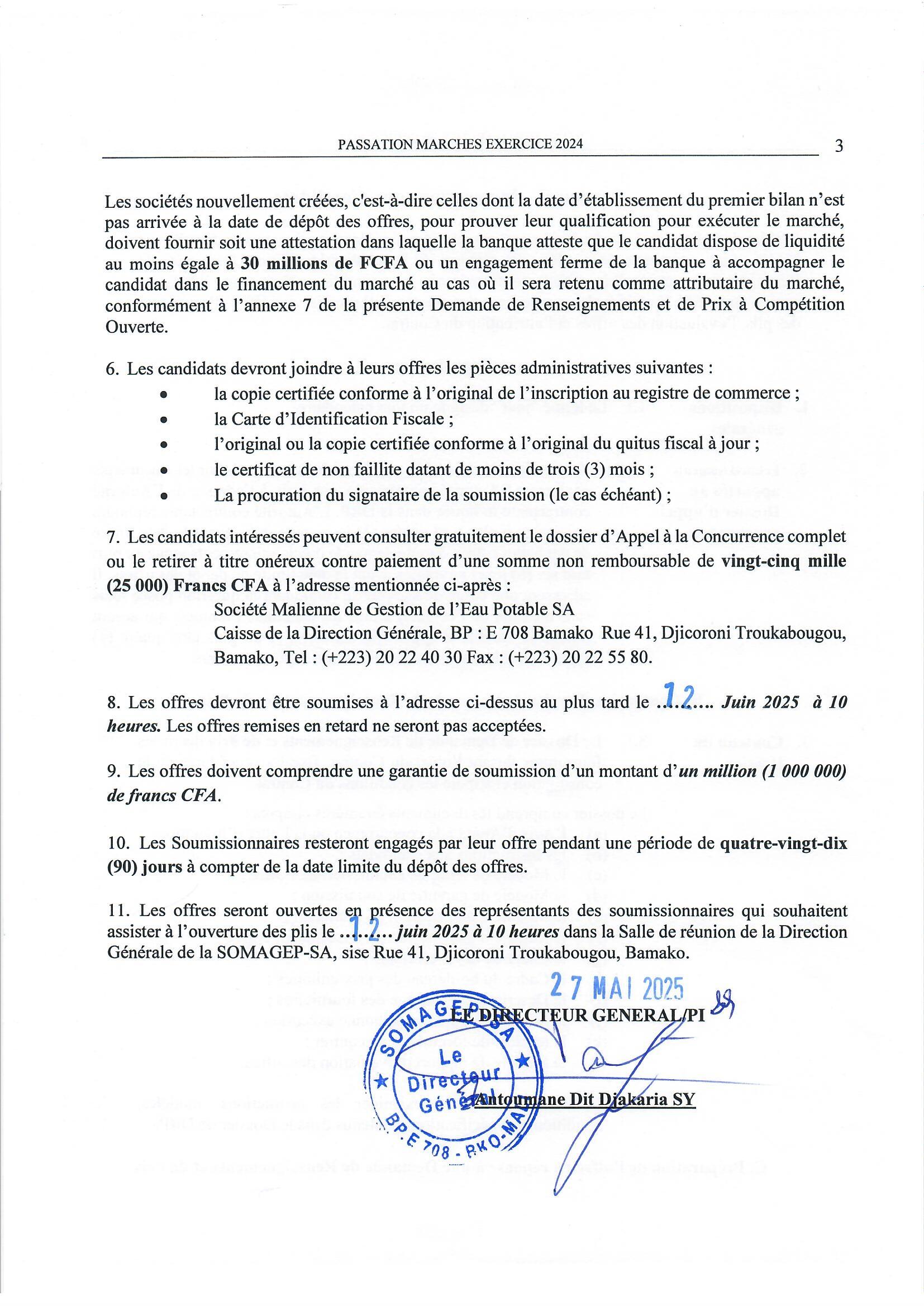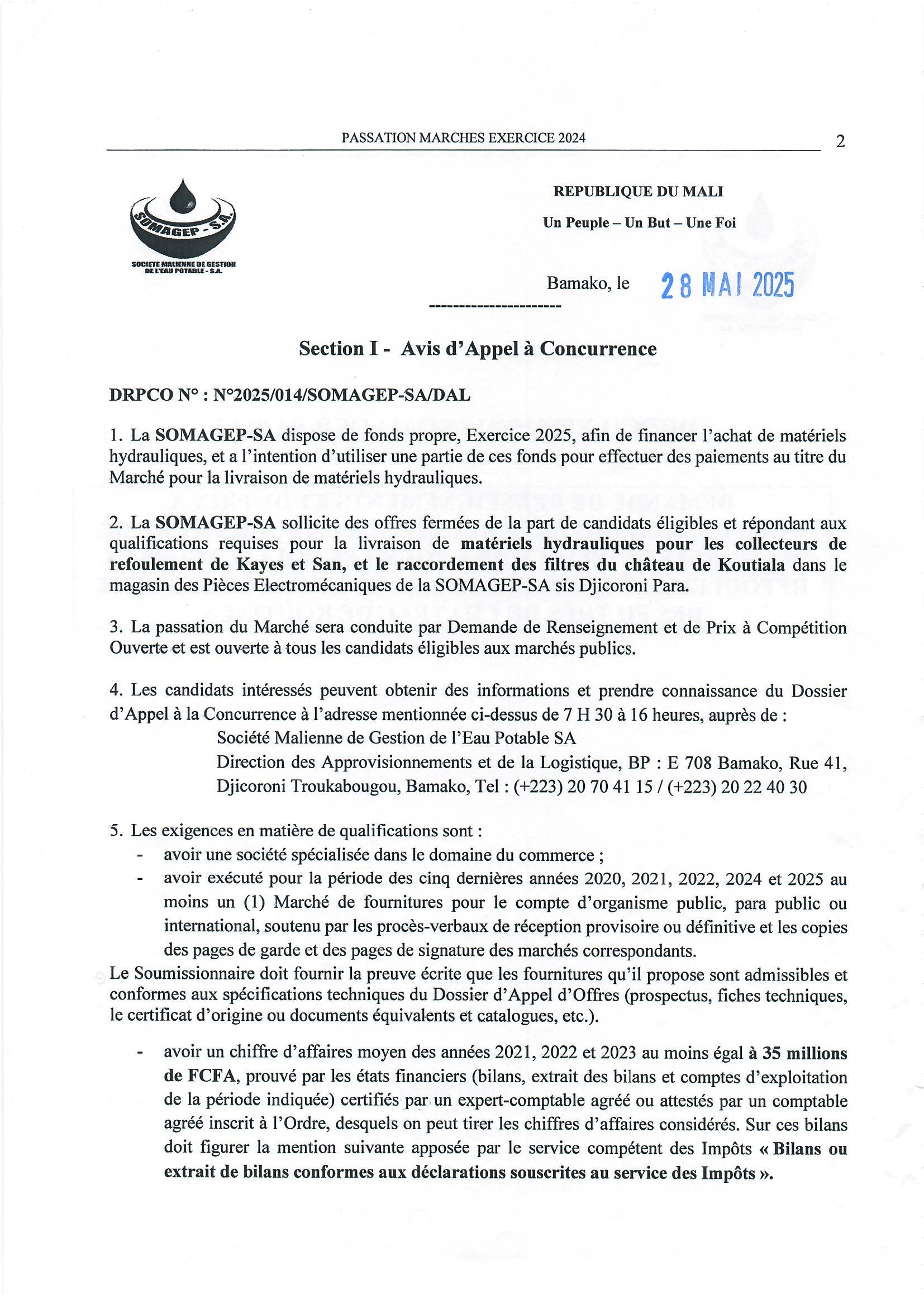 AAC-2025-02- SOMAGEP-SA-Avis d ‘Appel à Concurrence DRPCO N°: N°2025/014/SOMAGEP-SA/DAL mai 29, 2025 | Aucun commentaire