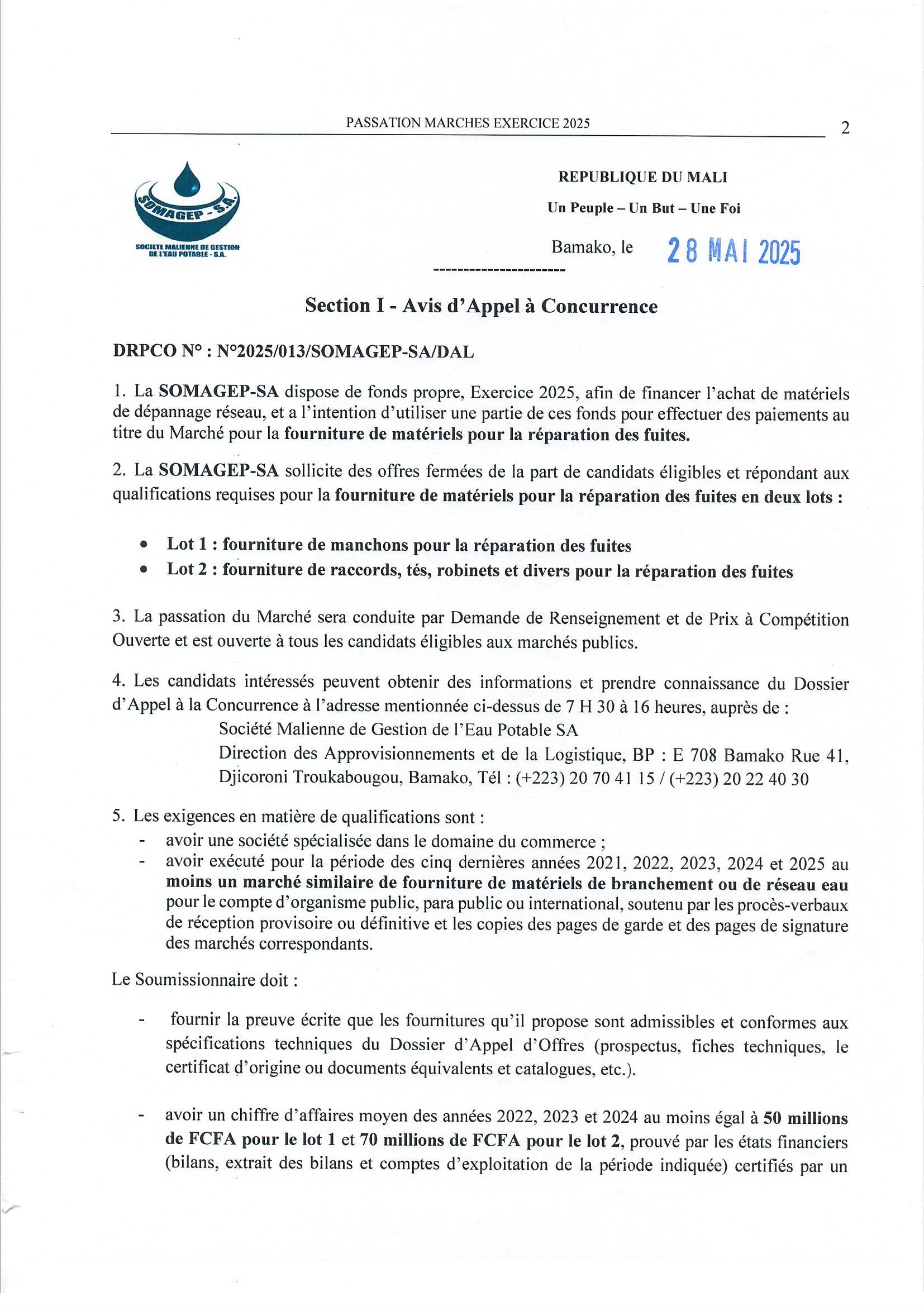 ← AAC-2025-02- SOMAGEP-SA-Avis d ‘Appel à Concurrence DRPCO N°: N°2025/014/SOMAGEP-SA/DAL