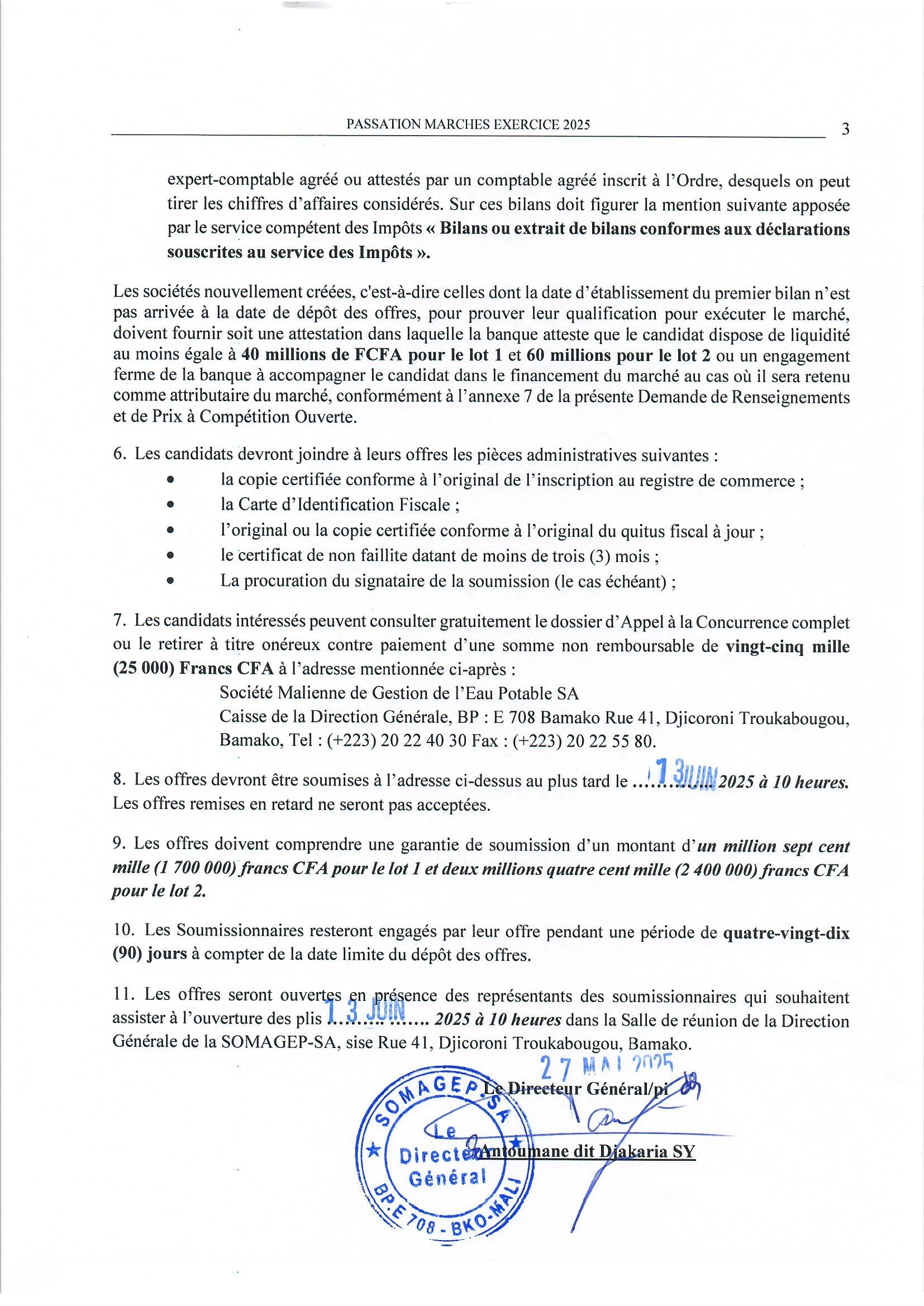 AAC-2025-03- SOMAGEP-SA-Avis d ‘Appel à Concurrence DRPCO N°: N°2025/013/SOMAGEP-SA/DAL