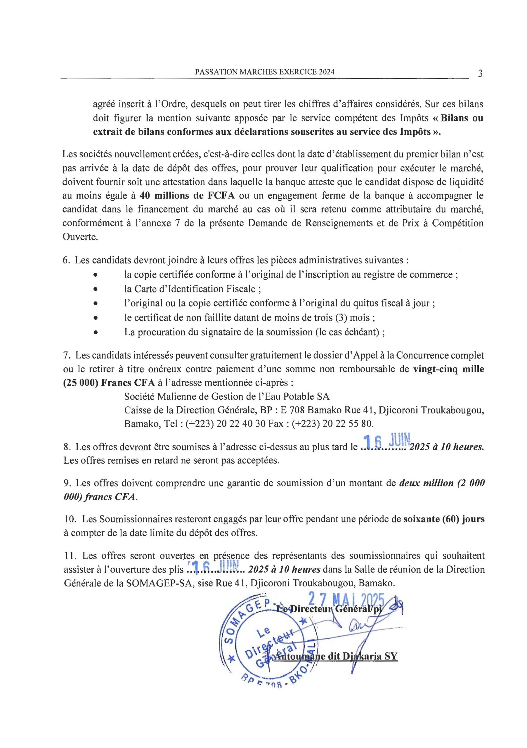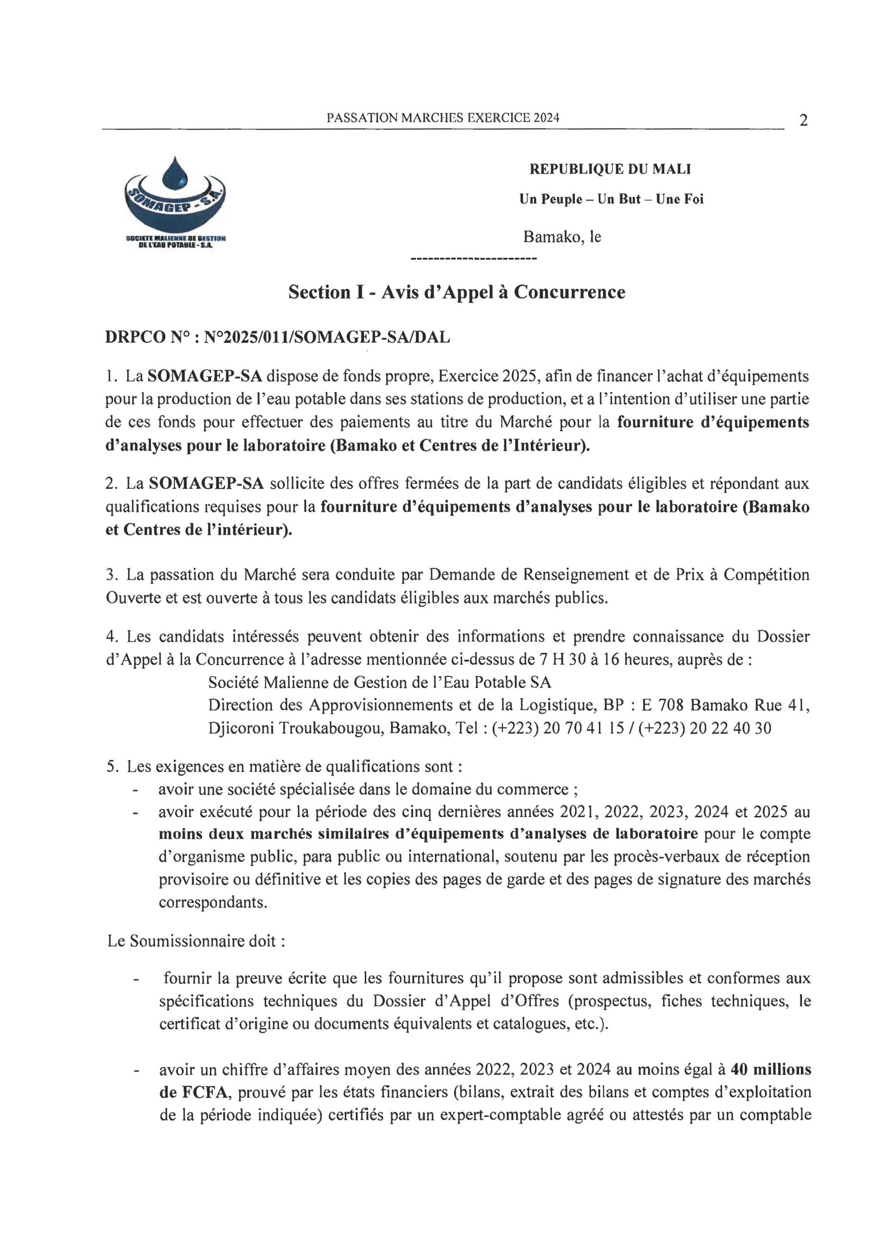 AAC-2025-03- SOMAGEP-SA Avis d ‘Appel à Concurrence DRPCO N° : N° 2025/011/SOMAGEP-SA/DAL mai 30, 2025 | Aucun commentaire