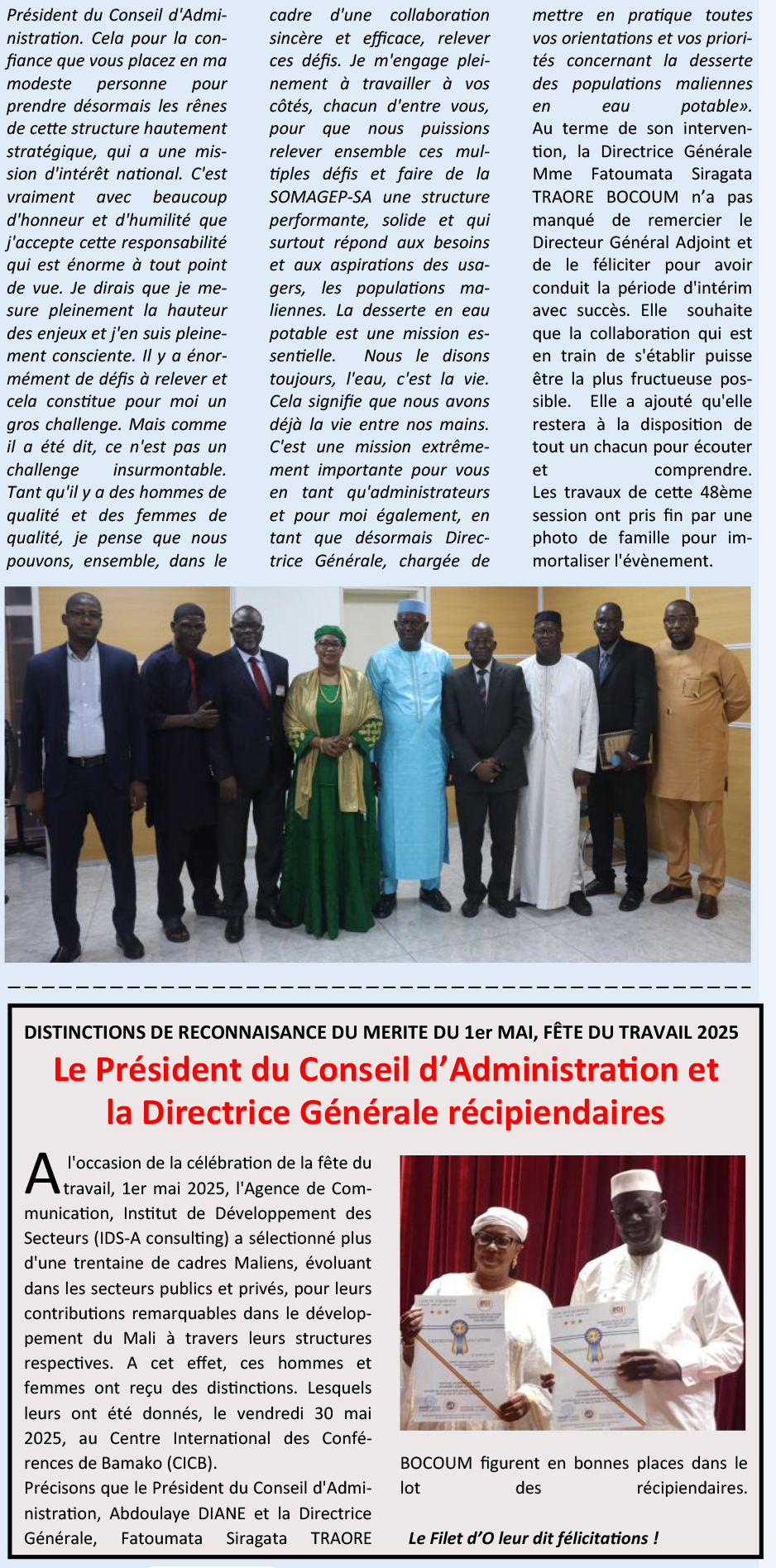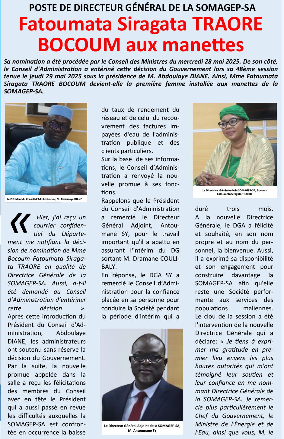 - - - Mme Bocoum Fatoumata Siragata Traoré est la nouvelle Directrice Générale de la SOMAGEP-SA - - - Elle était précédemment Directrice Générale du Centre Malien de promotion de la Propriété Industrielle (CEMAPI) - - - La nouvelle Directrice Générale a pris fonction le jeudi 5 juin 2025 - - -