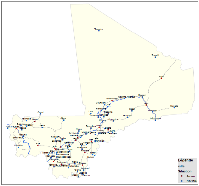 KATI, BAFOULABE, DIEMA, KENIEBA, KOULIKORO, BATAMA, BANANKORO, SIBY, NARA, OUELESSEBOUGOU, KOLONDIEBA, LOULOUNI, SEGOU, NIONO, SIRIBALA, BLA, BARAOUELI, FANA, DIOILA, DJENNE, DIORO, SOFARA, KORO.